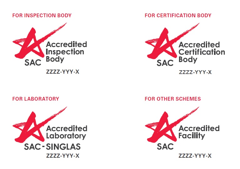 When reference to SAC accreditation status is made by an accredited organisation using SAC accreditation marks, the Certificate Number issued to the accredited organisation shall be indicated. Specimens of the SAC accreditation marks are shown above, which include the logo, the accredited scheme and the certificate number.